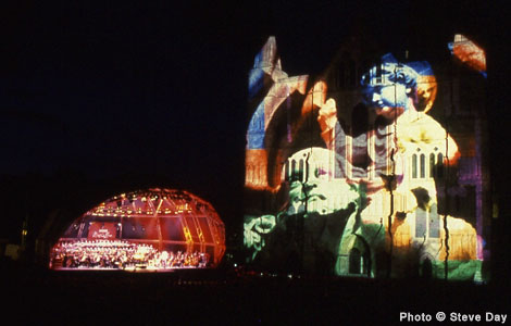 Eight Centuries involved eight ensembles playing music from the C13th to the C20th to picnickers in the Cathedral Grounds. Artisans, whose work would have been used in the cathedral, demonstrated their skills and sheep, cows, llamas, horses, goats and dogs paraded around the green. When the sun set, the audience of 6000 took their seats in the grandstand for a concert of Carmina Burana , accompanied by projections on the cathedral and played by the Bournemouth Symphony Orchestra conducted by Robert Ziegler. The event was broadcasted as part of BBC TV Music Live. Projections and lighting by Simon Corder and Patrick Watkinson, sound by John Del'Nero and costumes by Katy McPhee.