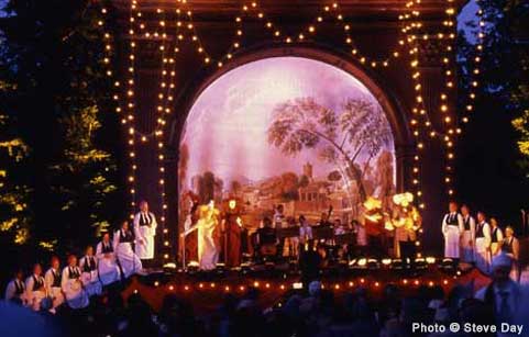 Commissioned by the Salisbury Festival in 1999 for the Larmer Tree Victorian Pleasure Garden and recreated at Elsing Hall for the 2011 Norwich and Norfolk Festival, produced by Artichoke. The audience of two hundred and fifty six, each   with their own personal waiter, enjoy a five course al fresco dinner hosted by characters from Alice in Wonderland. Each course is taken at a different location ending with coffee and jelly and a concert performed by their hosts and a choir of singing waiters. Text by David Gale, music by Frank Millward, design by Simon Corder, sound by John Del Nero, costumes by Katy McPhee and the Elsing Hall dinner designed by Bompas & Parr.  |
